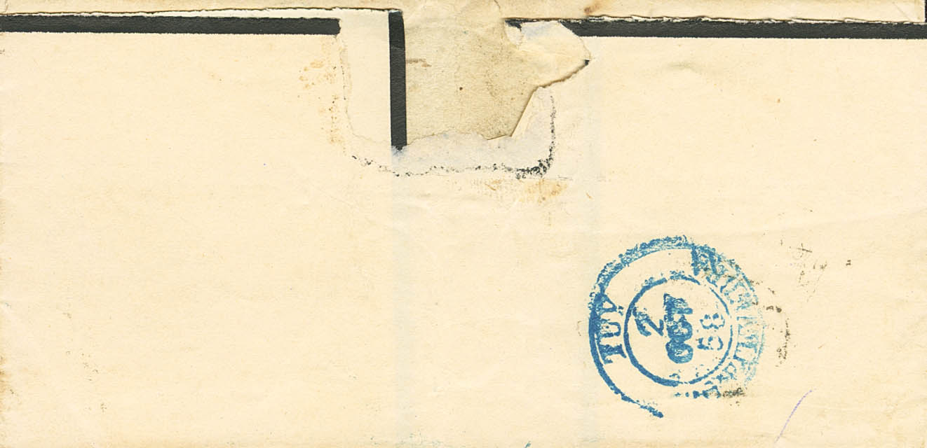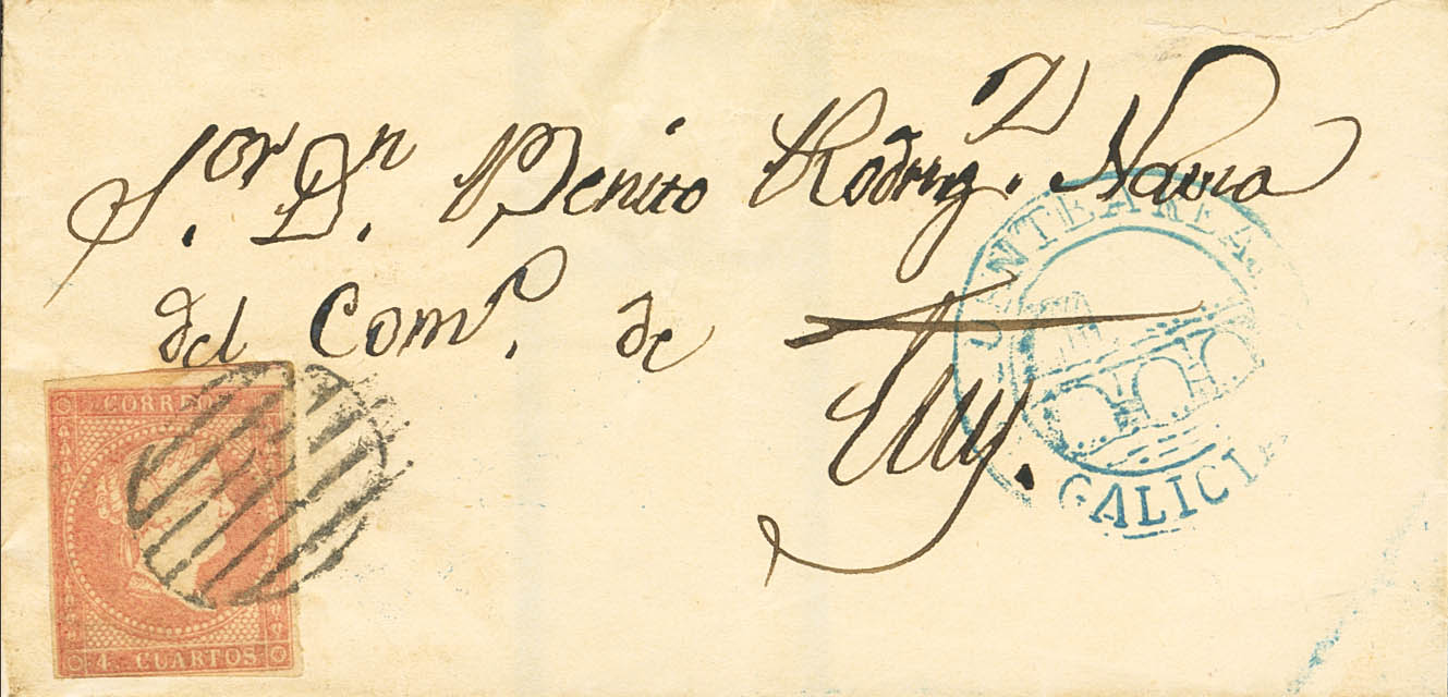 |ABOUT| 48. 1858. 4 red quarters. PUENTEAREAS to TUY. PARRILLA postmark and on the front pre-philatelic mark PUENTEAREAS / GALICIA, in blue. MAGNIFICENT.