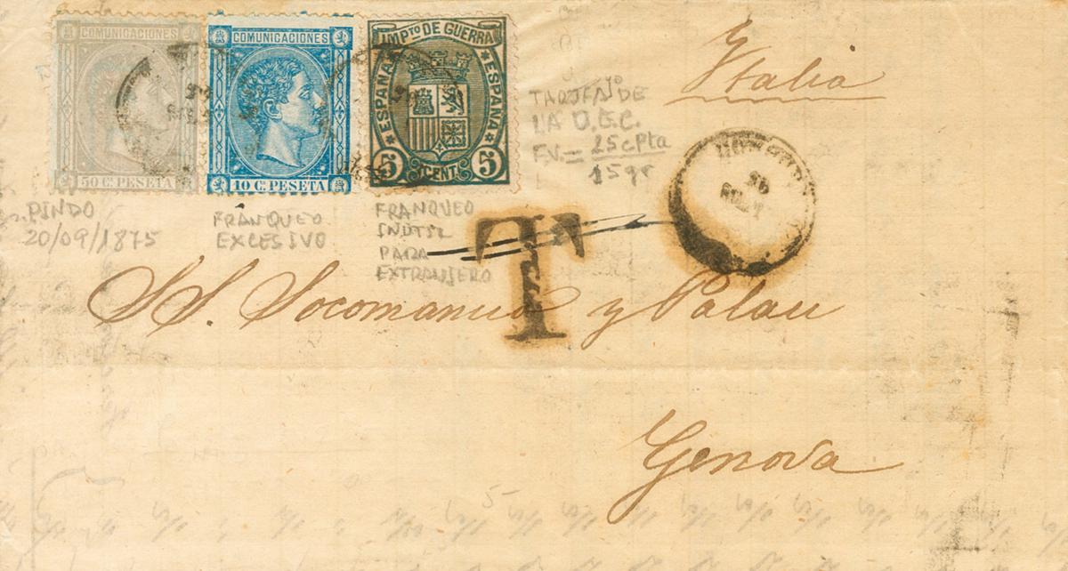 |ENVELOPE| 164, 168, 154. 1875. 10 cts blue, 50 cts lilac and 5 cts green War Tax. PINDO (LA CORUÑA) to GENOVA (ITALY). The War Tax stamp was not applicable to foreigners, the letter was valued despite carrying the equivalent of double postage (with an excess of 10 cts). MAGNIFICENT AND UNUSUAL POSTAGE COMBINATION.
