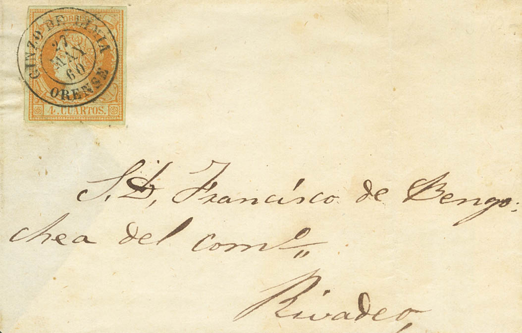 |ABOUT| 52. 1860. 4 orange quarters. GINZO DE LIMIA to RIBADEO (LUGO). Postmark GINZO DE LIMIA / ORENSE. MAGNIFICENT AND SPECTACULAR PRINTING.