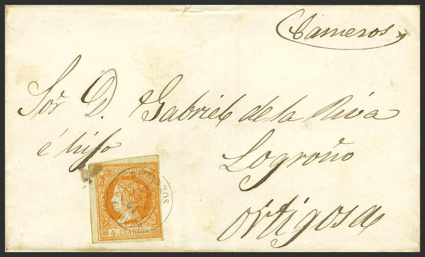 52. 1861. 4 cuartos yellow. BETANZOS to ORTIGOSA. Postmark BETANZOS / CORUÑA. MAGNIFICENT.