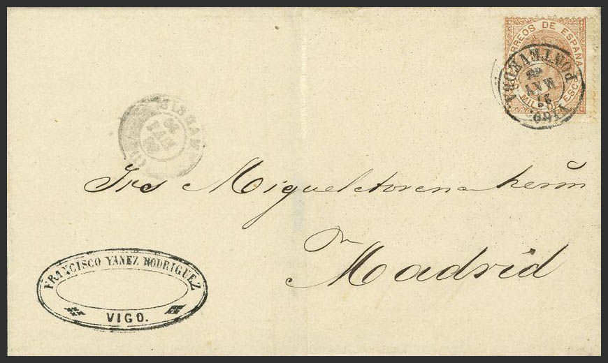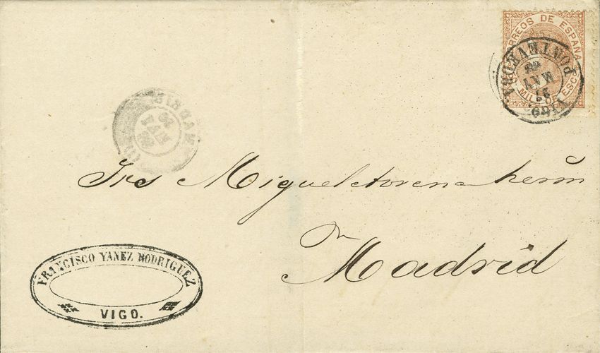 96. 1868. 50 mils chestnut. VIGO to MADRID. Postmark VIGO / PONTEVEDRA. MAGNIFICENT AND RARE.
