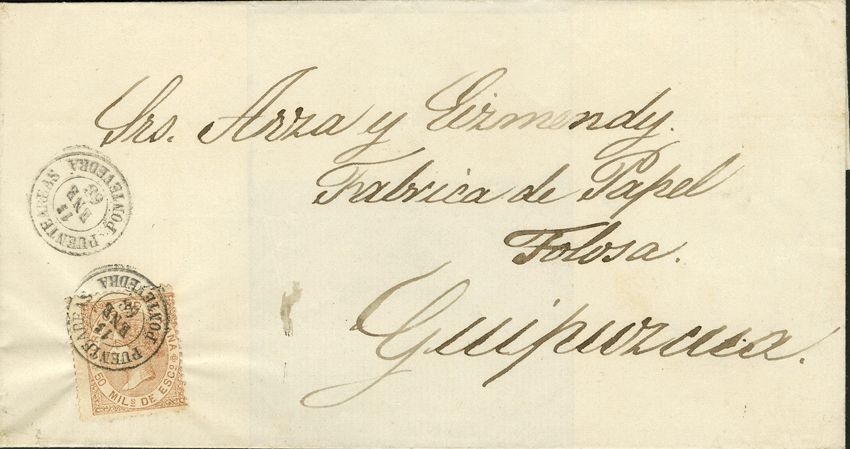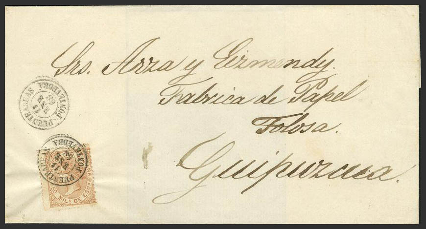 96. 1868. 50 mils chestnut. BRIDGE TO GUIPUZCOA. Postmark PUENTEAREAS / PONTEVEDRA. MAGNIFICENT.
