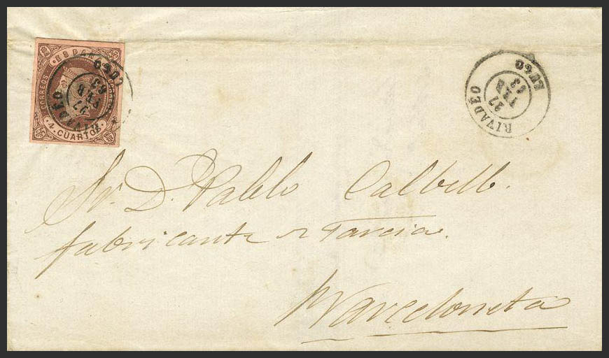 58. 1863. 4- cuartos chestnut. RIVADEO to BARCELONA. Postmark RIVADEO / LUGO. MAGNIFICENT.