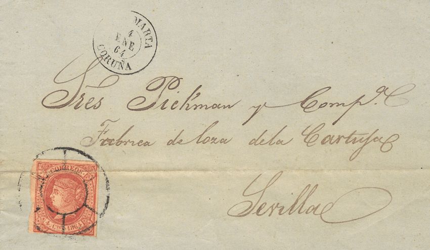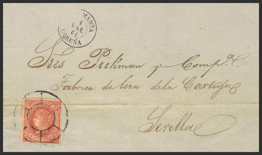 64. 1864. 4 salmon cuartos . SANTA MARTA to SEVILLE. Postmark R. CARRETA MUDO, from Santa Marta, light horizontal fold. MAGNIFICENT AND VERY RARE, NO MORE THAN THREE OR FOUR KNOWN.