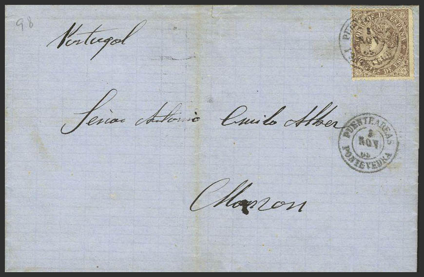 98. 1868. 50 mils violet. YOU WILL BRIDGE TO PORTUGAL. MAGNIFICENT AND UNUSUAL DESTINATION.