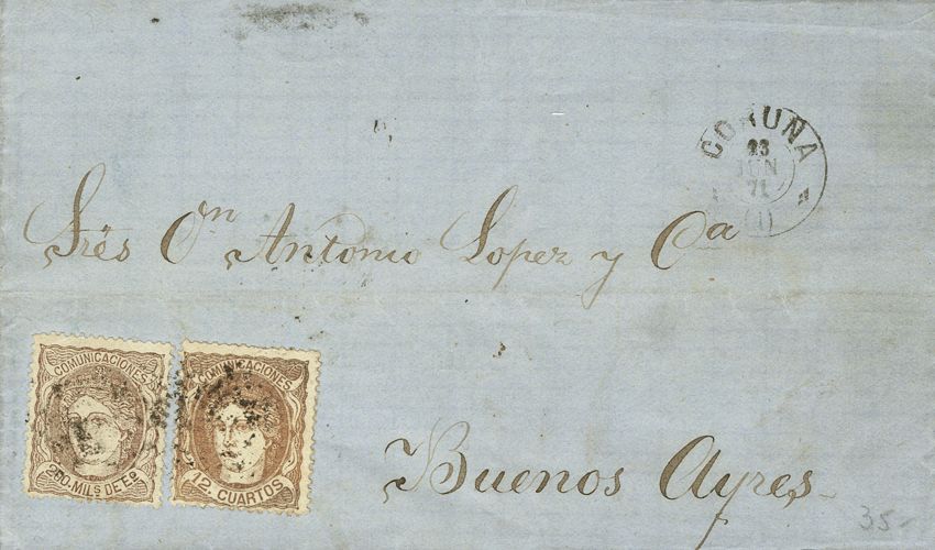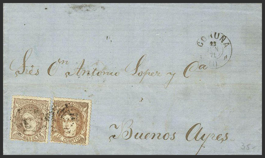 109, 113. 1870. 200 mils and 12 cuartos. CORUÑA to BUENOS AIRES. MAGNIFICENT.