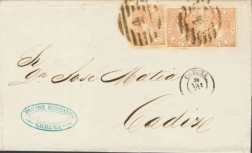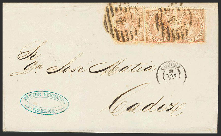 96(3). 1867. 50 chestnut mils, three stamps. CORUÑA to CADIZ. Triple bearing. MAGNIFICENT.