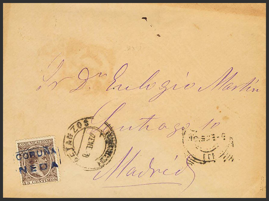 219. 1898. 15 chestnut cts. NEDA to MADRID. Mail postmark NEDA / CORUÑA, in blue. MAGNIFICENT.