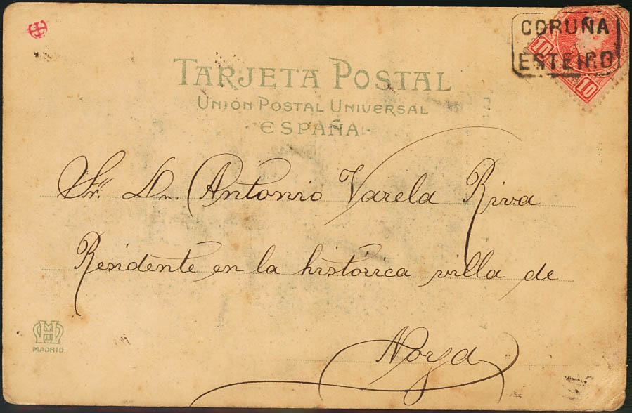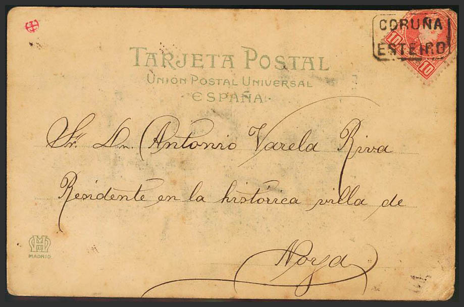 English 243. 1903. 10 cts red (seal folded to the obverse, fully preserved). ESTEIRO to NOYA. Mail postmark CORUÑA / ESTEIRO. MAGNIFICENT.