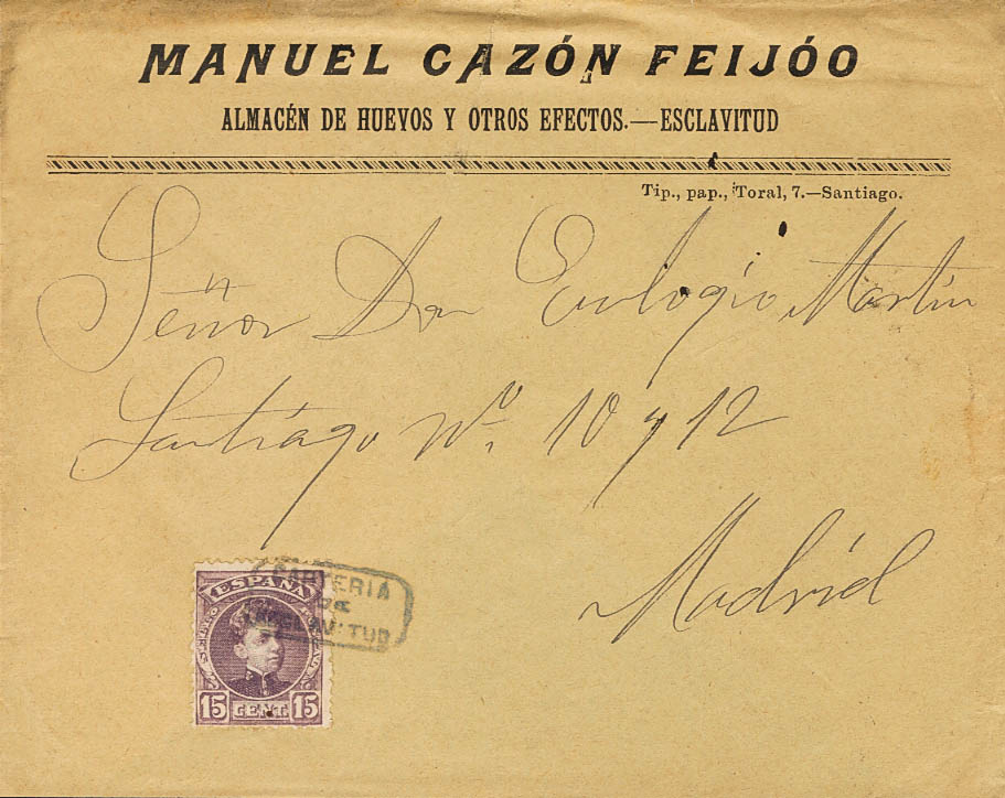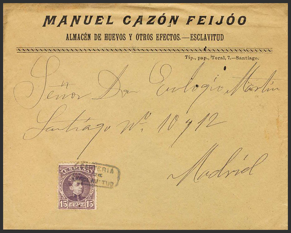English 245. 1904. 15 cts lilac chestnut. SLAVERY to MADRID. Postmark CARTERIA / OF / SLAVERY. MAGNIFICENT AND RARE.