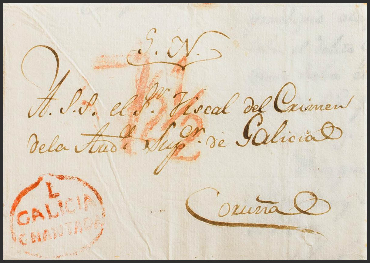 1823. CHANTADA to LA CORUÑA. Brand L / GALICIA / CHANTADA, in red (PE1) 2004 edition. MAGNIFICENT.