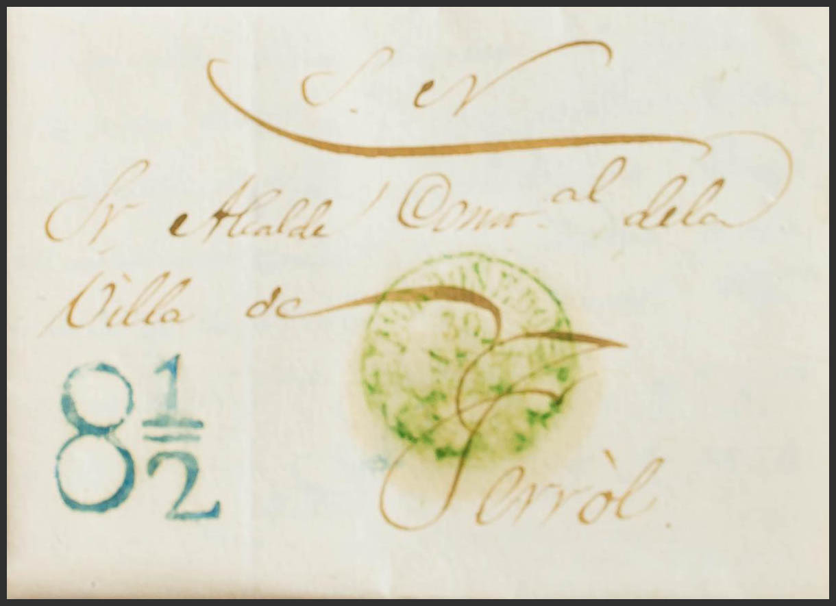 1844. MONDOÑEDO to EL FERROL. Baeza MONDOÑEDO / GALICIA, in green (diluted print at the bottom). BEAUTIFUL AND RARE.