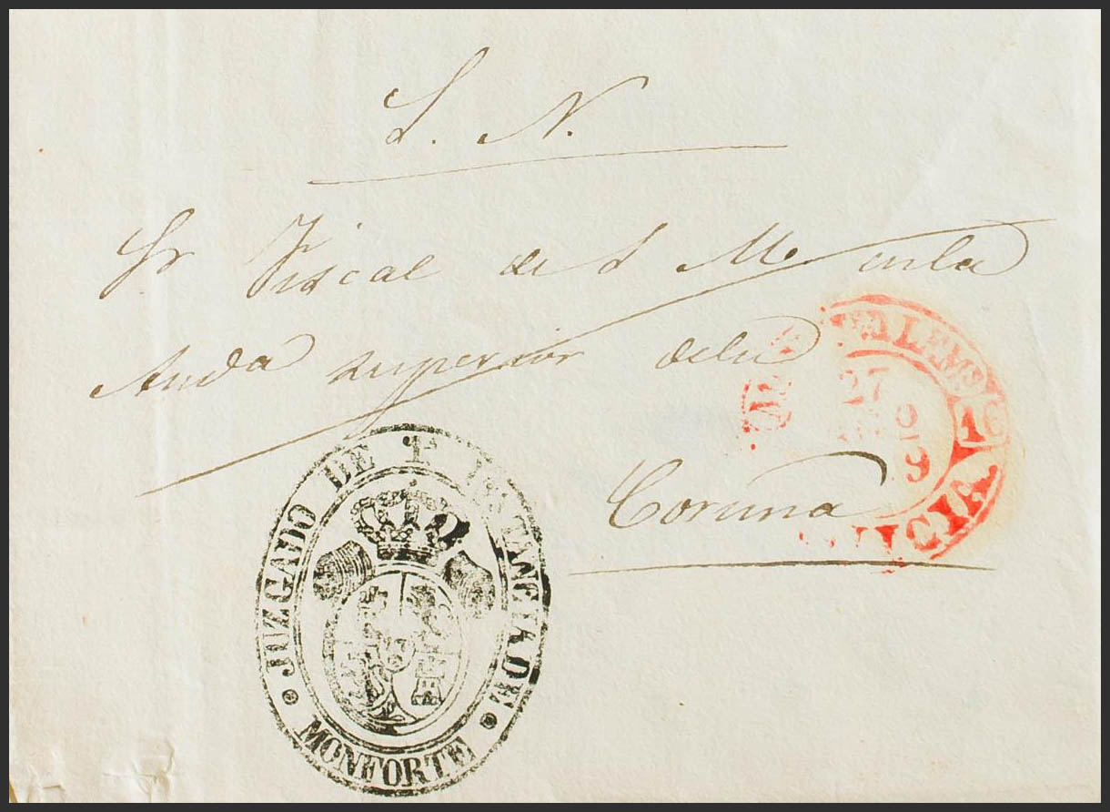 1849. MONFORTE DE LEMOS in LA CORUÑA. Baeza MONFTE. D. LEMS / GALICIA, in red. MAGNIFICENT.