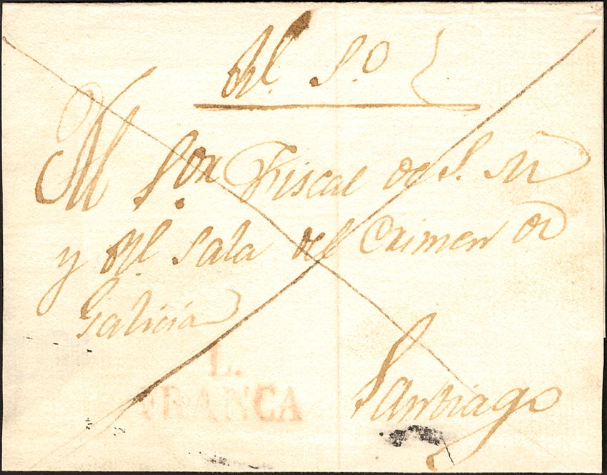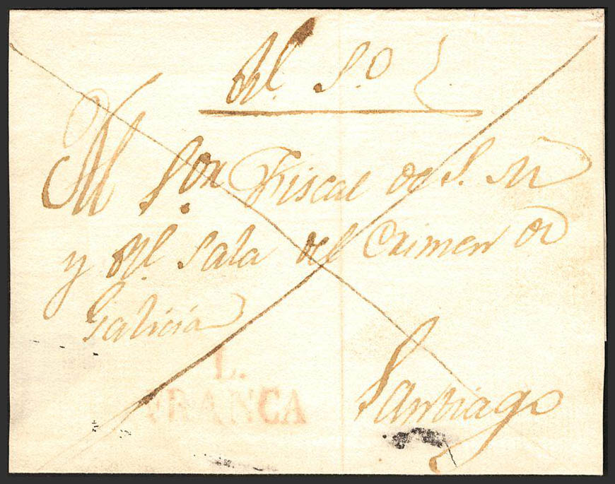 (1828ca). LUGO to SANTIAGO. Mark L / FRANCA, in red (PE 8). VERY RARE.