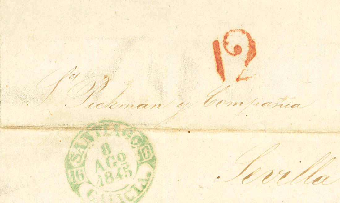 |ABOUT|1845. SANTIAGO DE COMPOSTELA to SEVILLE. Baeza SANTIAGO / GALICIA, in green. MAGNIFICENT.