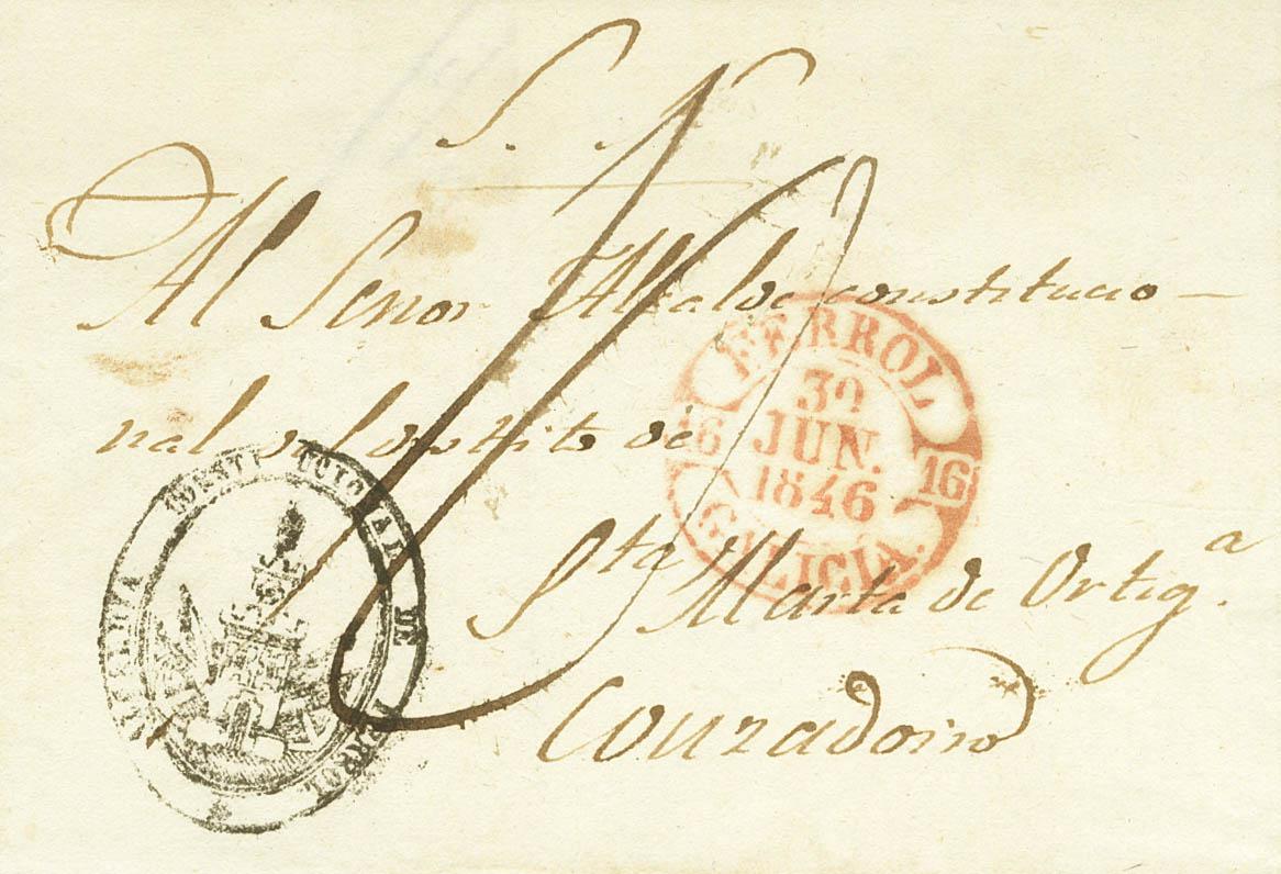 |ABOUT|1846. EL FERROL to COUZADOIRO (LA CORUÑA). Baeza FERROL / GALICIA, in red. MAGNIFICENT.