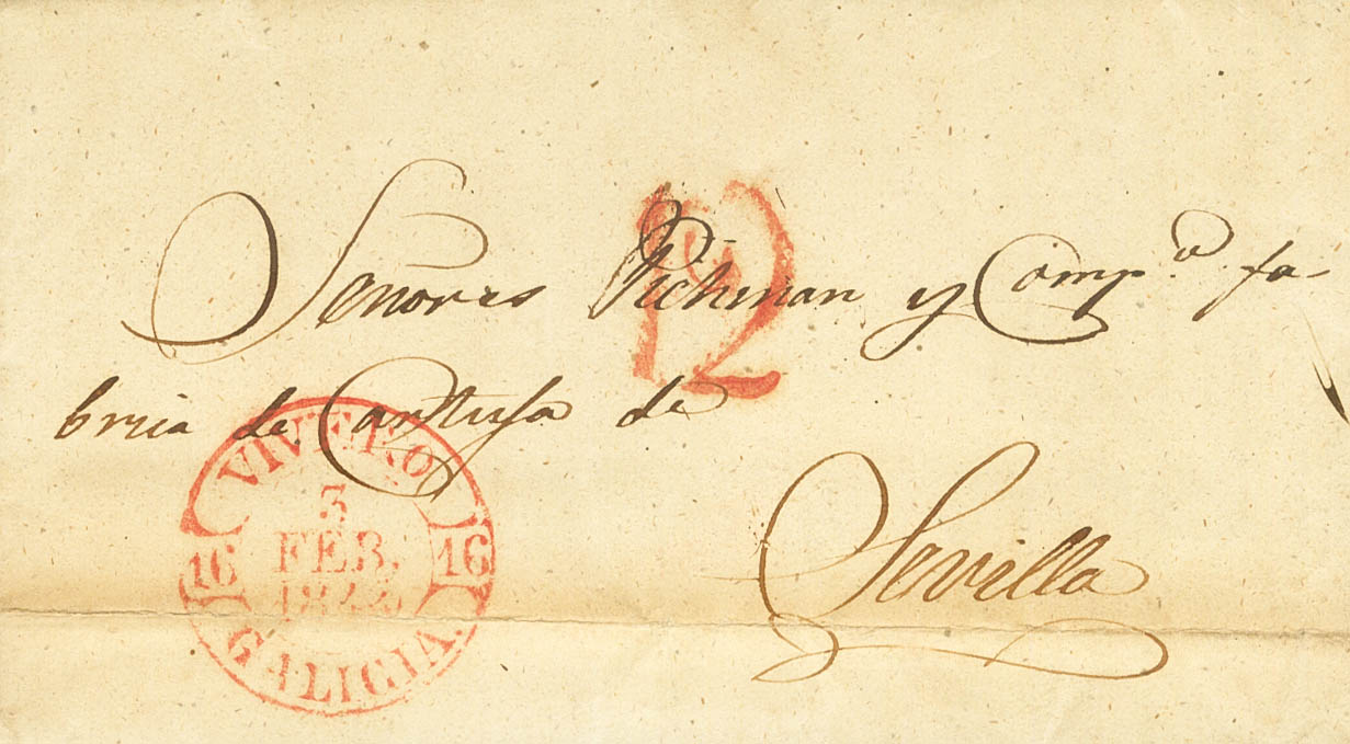 |ABOUT|1844. VIVERO (LUGO) in SEVILLE. Baeza VIVERO / GALICIA, in red. MAGNIFICENT.