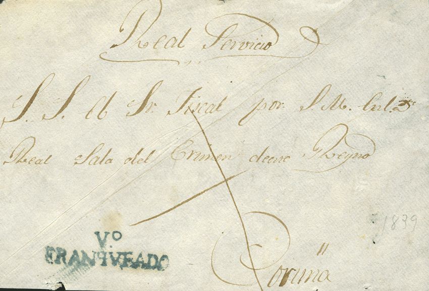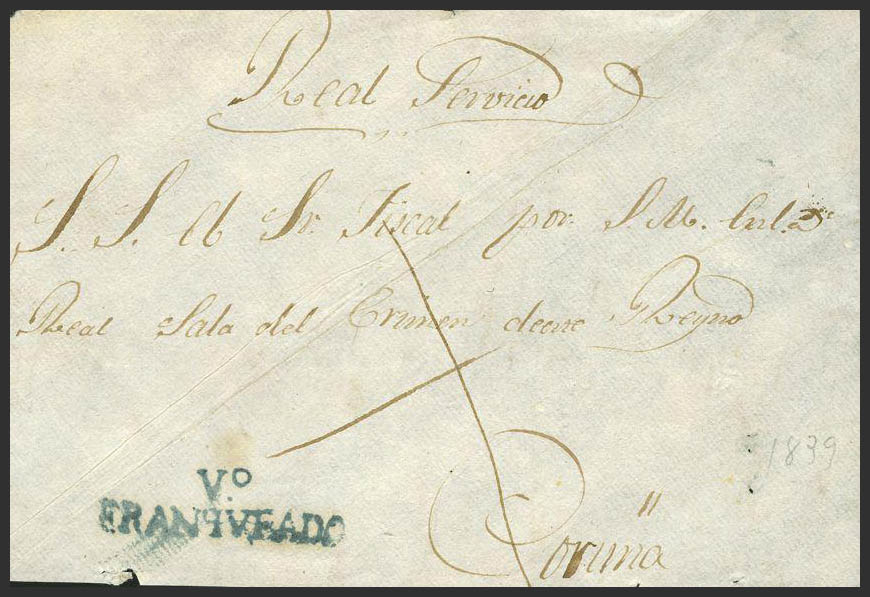English (1822ca). Front of Judicial Escrow from NURSERY to CORUÑA. Mark Vº / FRANQUEADO, in blue (PE9). MAGNIFICENT AND RARE.