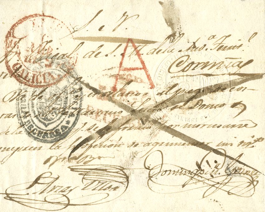 English (1845ca). Judicial Escrow from BECERREA to LUGO. Mark "A" for Fertilizer, in red, from Lugo (PE15) 2004 edition. MAGNIFICENT AND VERY RARE.
