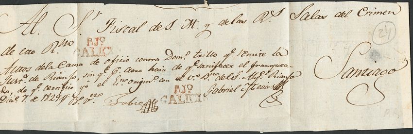 English 1829. Front of Judicial Escrow from RIANJO to SANTIAGO. RJO brand. / GALICIA (PE1) 2004 edition. MAGNIFICENT AND VERY RARE.