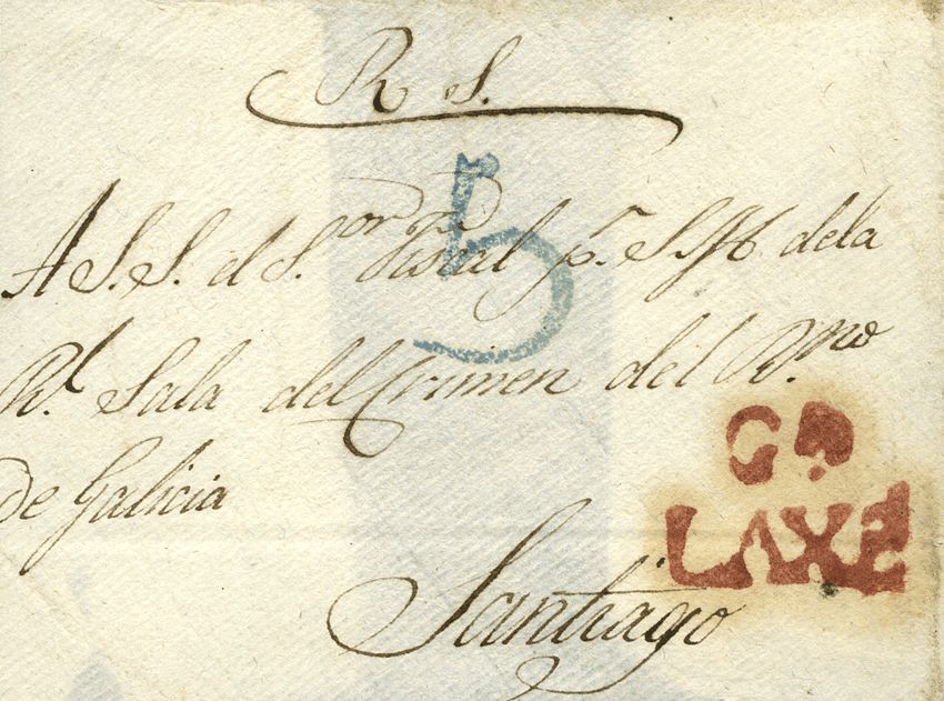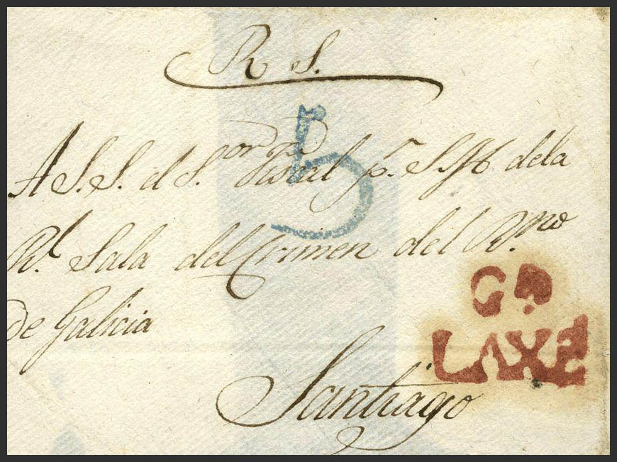 English (1824ca). Front of SANTA MARIA LAGE to SANTIAGO. Gº / LAXE brand, in red (PE1) 2004 edition. MAGNIFICENT AND VERY RARE.