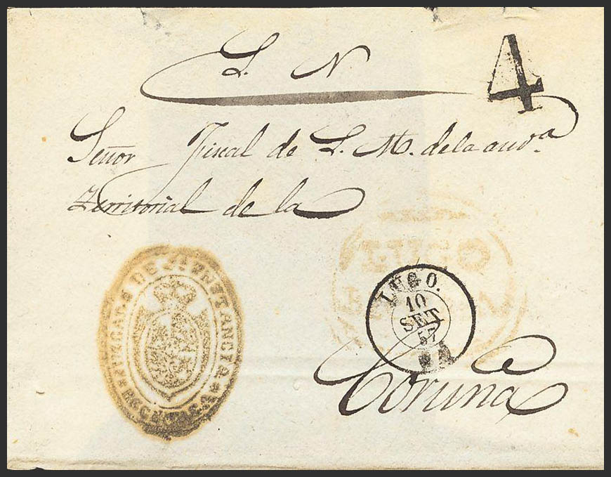 1857. Front of Judicial Escrow from SAN JUAN DE BECERREA to CORUÑA. LUGO / BECERREA brand, in red (PE1) 2004 edition. MAGNIFICENT AND VERY RARE.