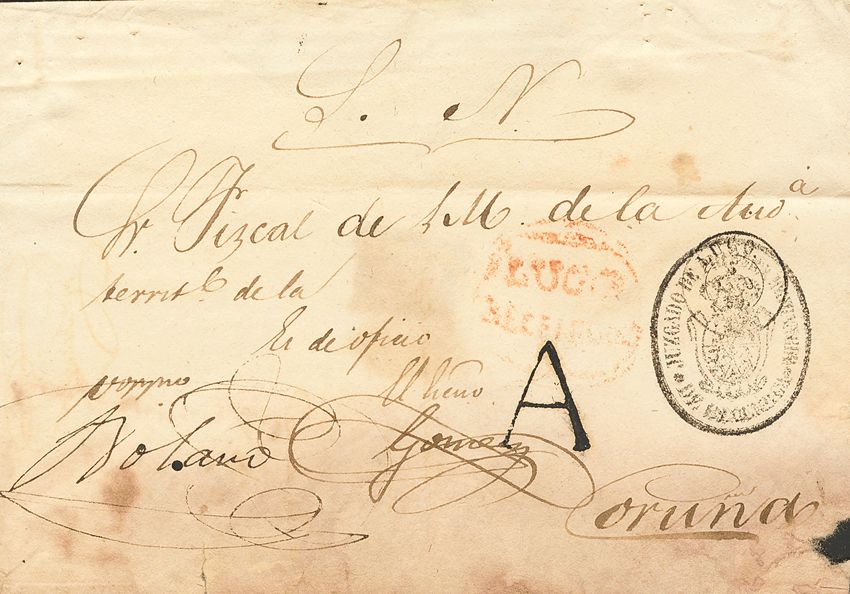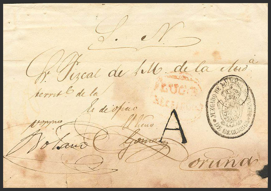 1850. Judicial Escrow of SAN JUAN DE BECERREA to CORUÑA. LUGO / BECERREA brand, in red (PE1) and "A", from Lugo (PE15) 2004 edition, damp spots. MAGNIFICENT AND VERY RARE.