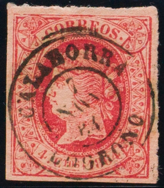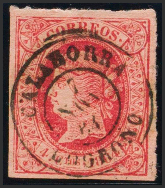 64. 1864. 4 red cuartos . Postmark CALAHORRA / LOGROÑO. MAGNIFICENT.