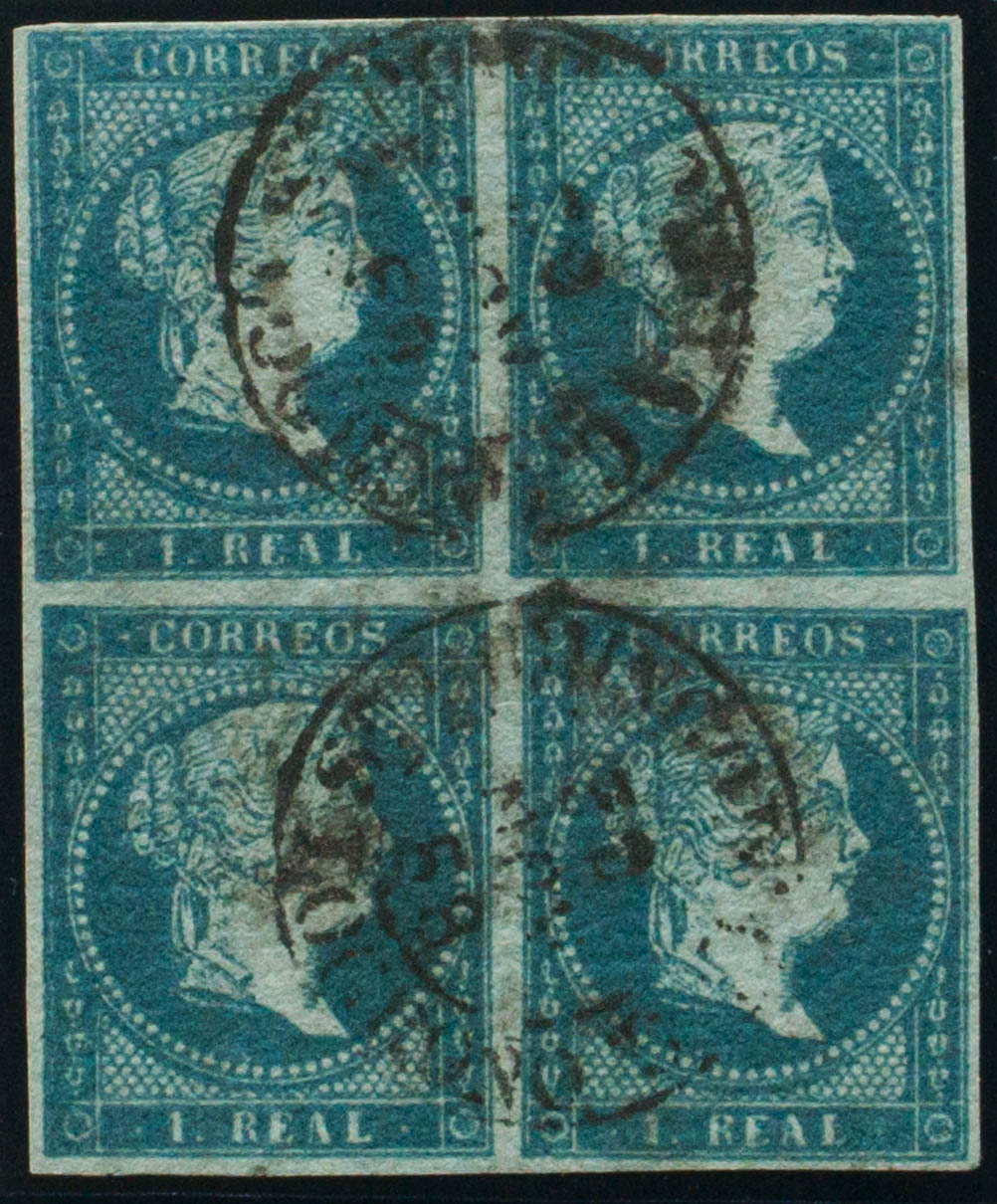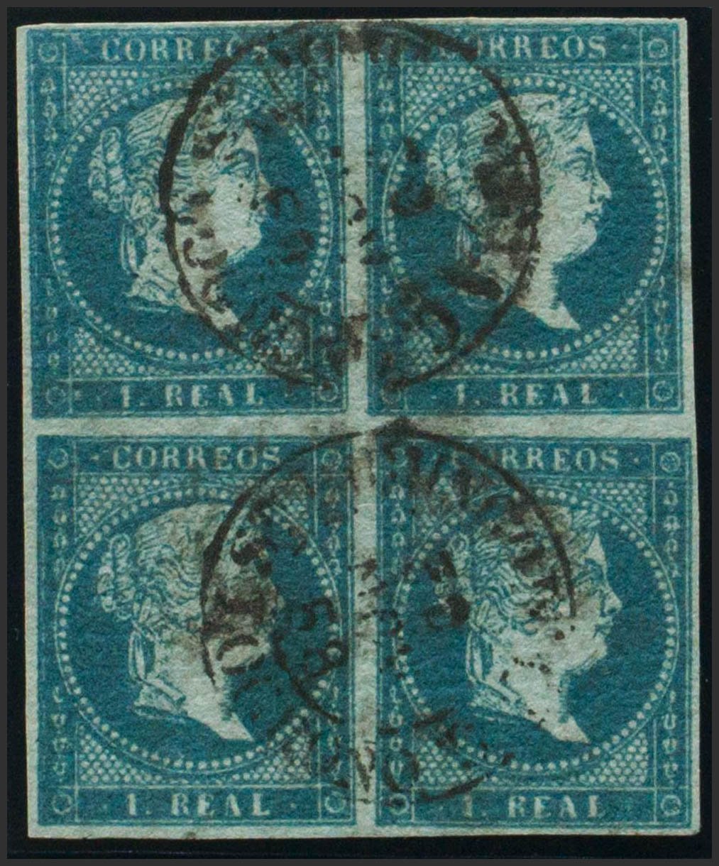 41(4). 1855. 1 real blue, block of four. Postmark STO DOMINGO DE LA C. (Type I) / LOGROÑO. MAGNIFICENT.