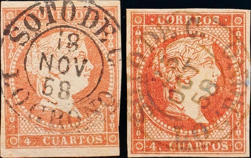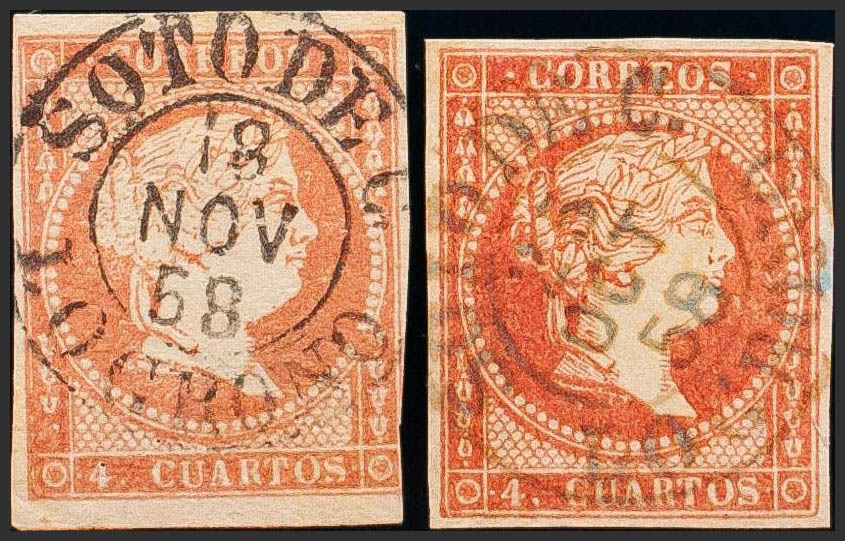 48(2). (1855ca). 4 red cuartos , two stamps. SOTO DE C. / LOGROÑO postmark (Type I), in black and blue. MAGNIFICENT.