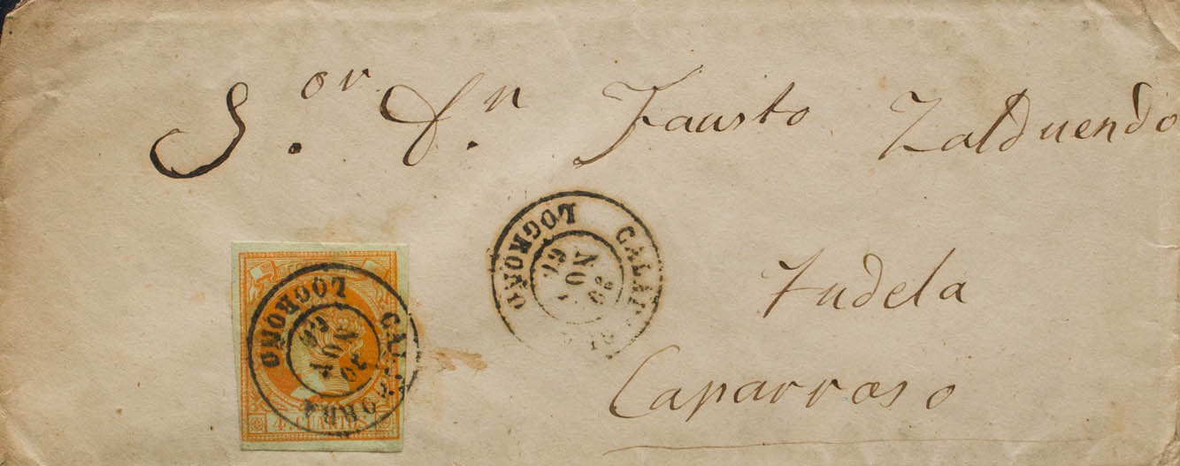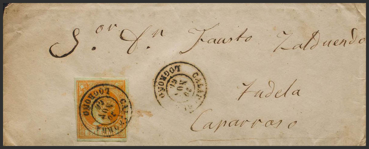 52. 1860. 4 orange cuartos . CALAHORRA (LOGROÑO) to TUDELA. Postmark CALAHORRA / LOGROÑO. MAGNIFICENT.
