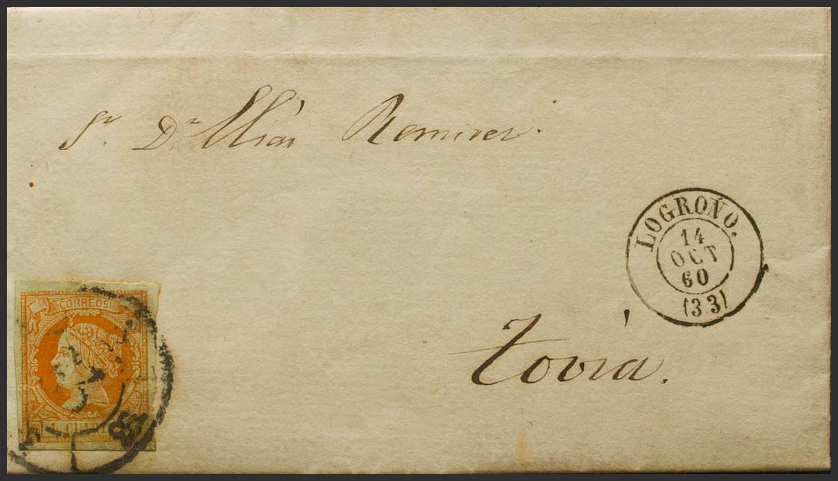52. 1860. 4 orange cuartos . LOGROÑO to TOBIA (LA RIOJA). Postmark R. CARRETA Nº33. MAGNIFICENT.