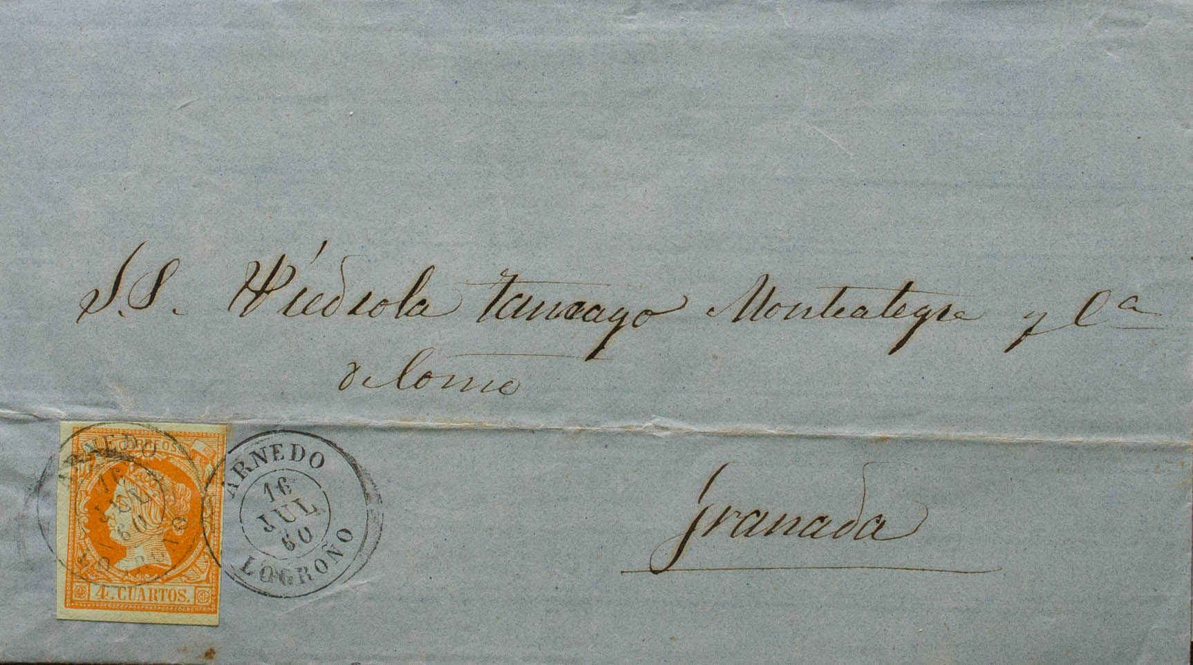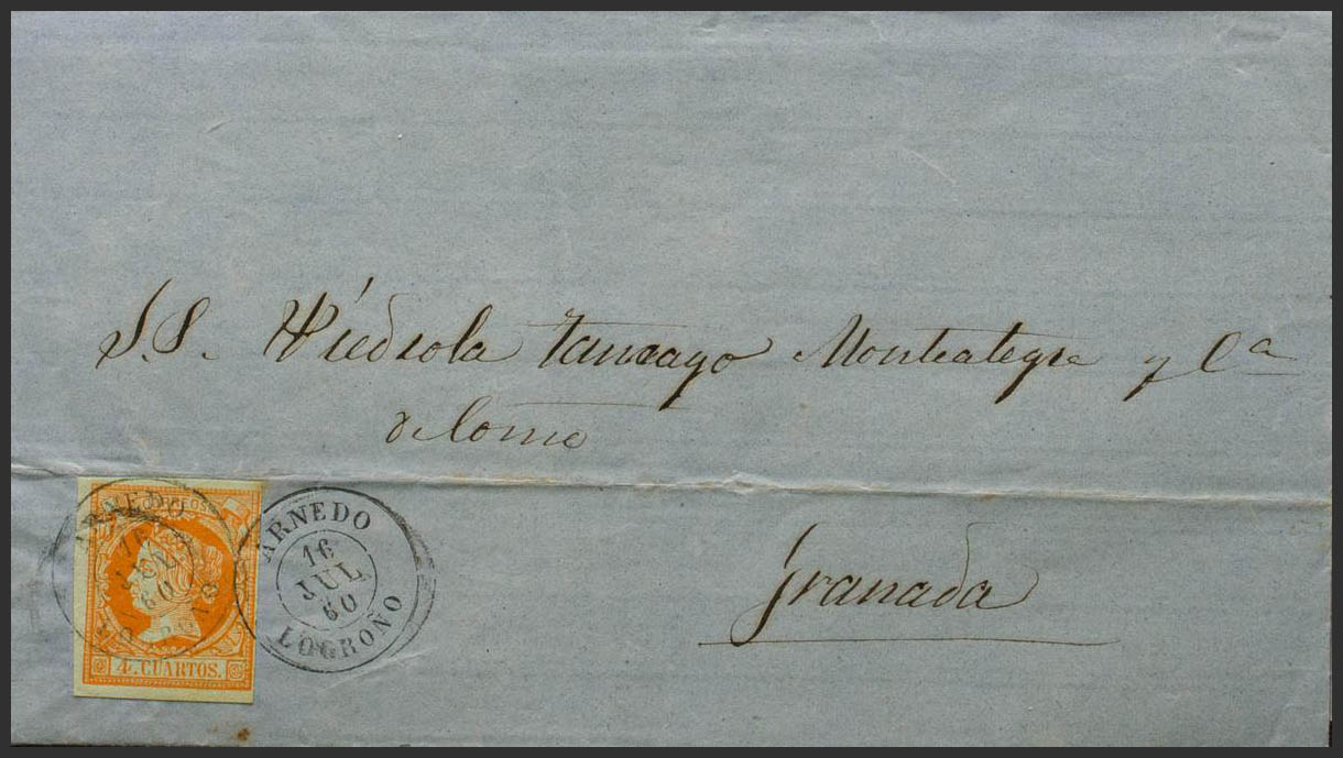 52. 1860. 4 orange cuartos . MUNILLA (LA RIOJA) to GRANADA. Postmark ARNEDO / LOGROÑO. MAGNIFICENT.