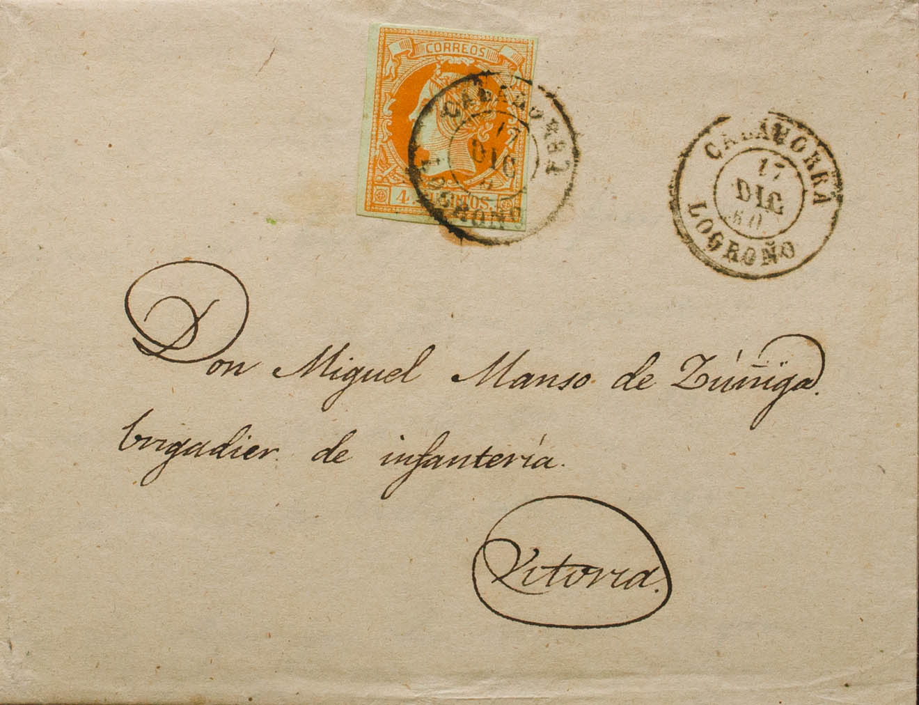 52. 1860. 4 orange cuartos . CALAHORRA to VITORIA. Postmark CALAHORRA / LOGROÑO. MAGNIFICENT.