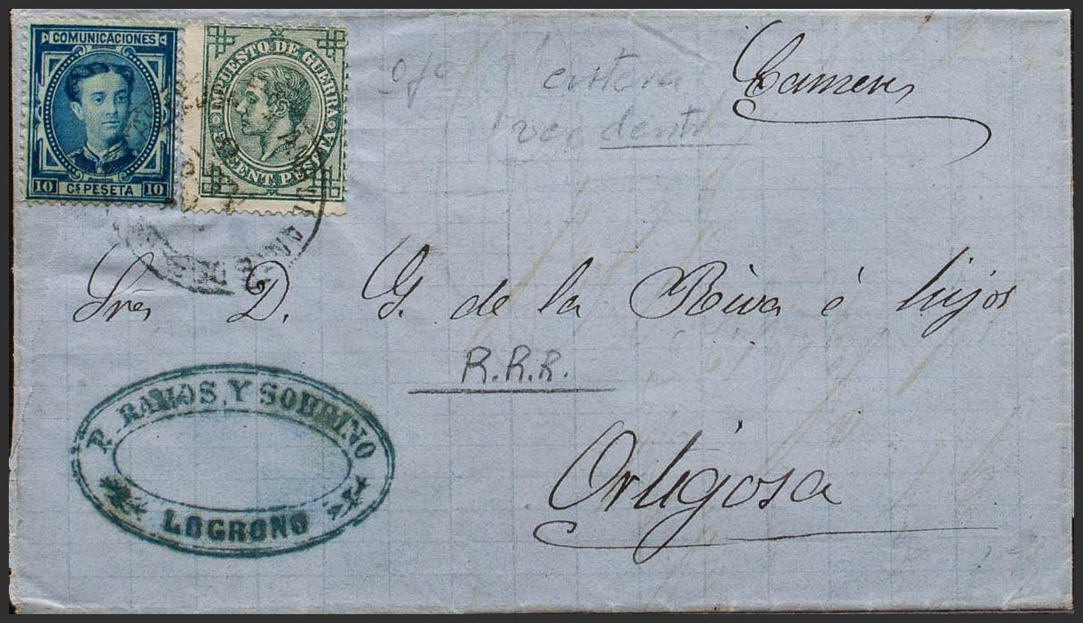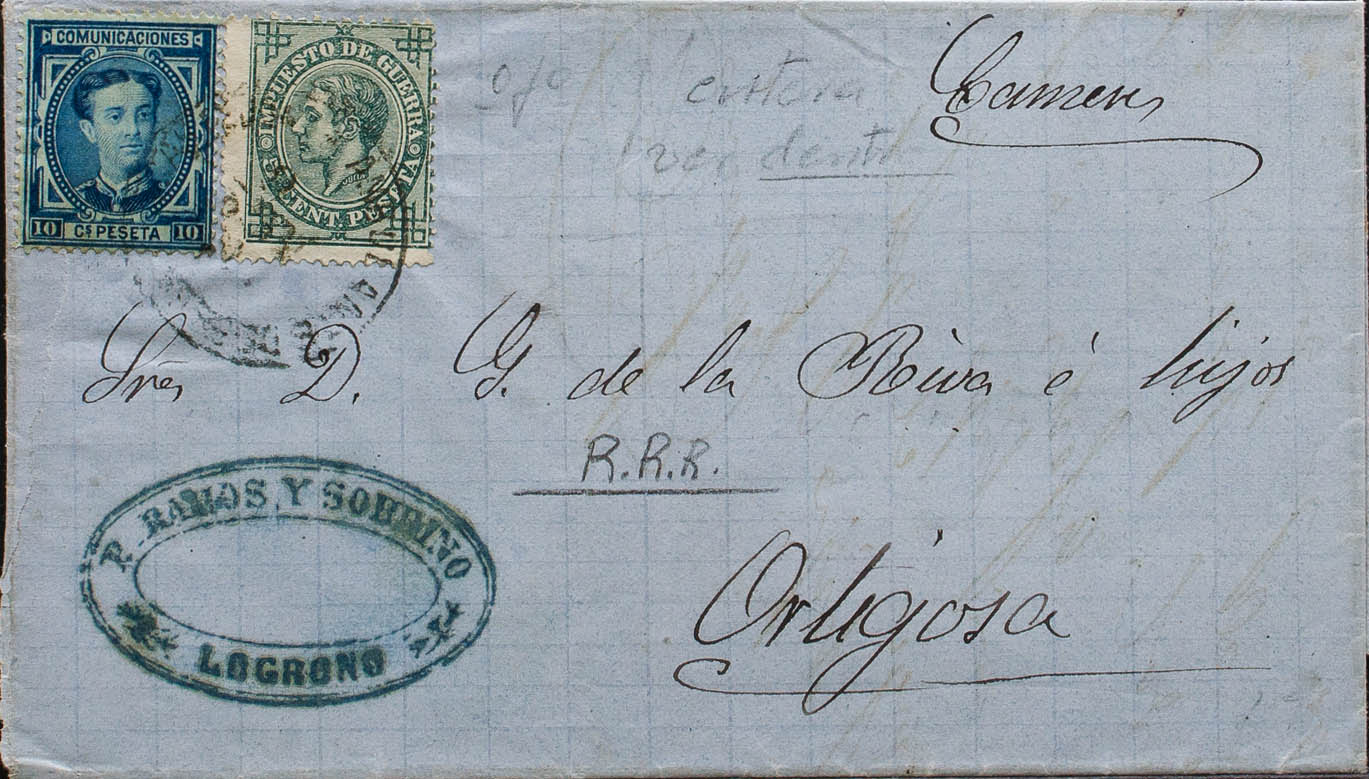 175, 183. 1876. 10 cts blue and 5 cts green. LOGROÑO to ORTIGOSA DE CAMEROS. AMB postmark. DESCENDING *FROM GRANADA?*. MAGNIFICENT.