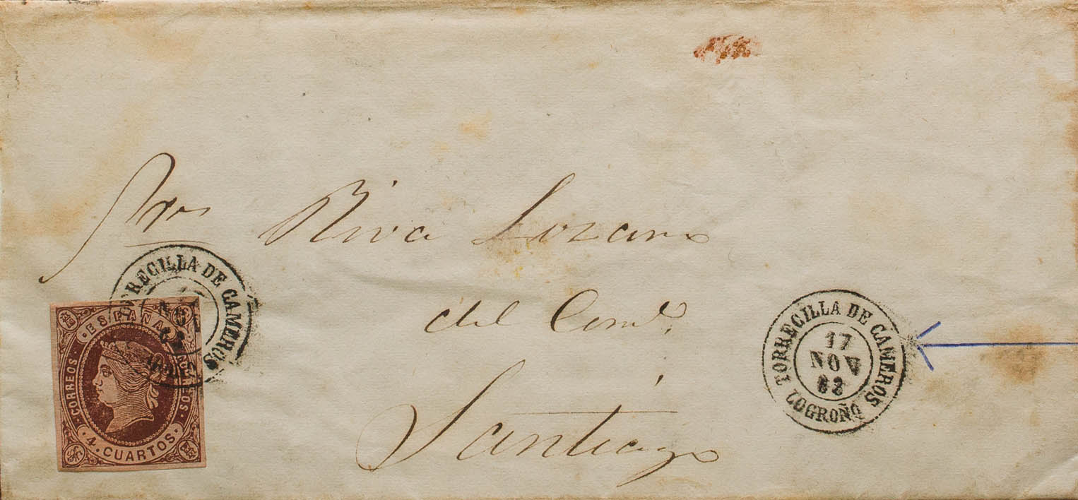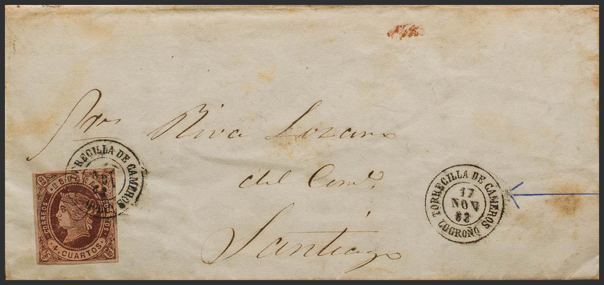 58. 1862. 4- cuartos chestnut. ORTIGOSA DE CAMEROS to SANTIAGO. Postmark TORRECILLA DE CAMEROS / LOGROÑO. MAGNIFICENT.