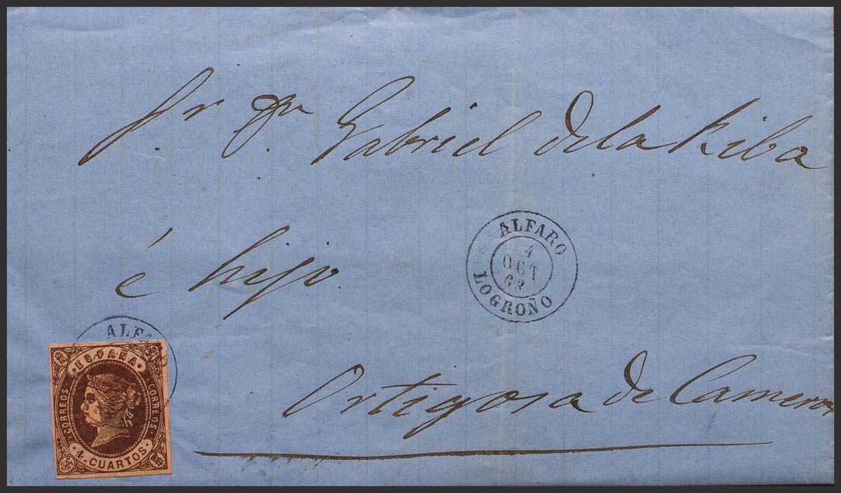 58. 1863. 4- cuartos chestnut. ALFARO to ORTIGOSA DE CAMEROS. Postmark ALFARO / LOGROÑO. MAGNIFICENT.