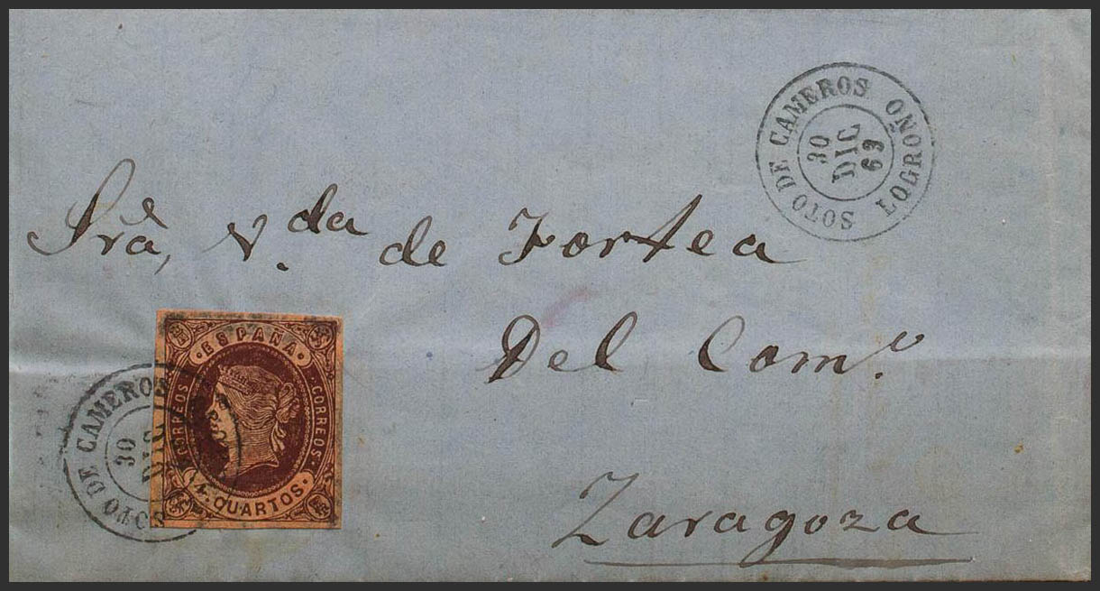 58. 1863. 4- cuartos chestnut. SOTO DE CAMEROS to ZARAGOZA. Postmark SOTO DE CAMEROS / LOGROÑO. MAGNIFICENT AND RARE.