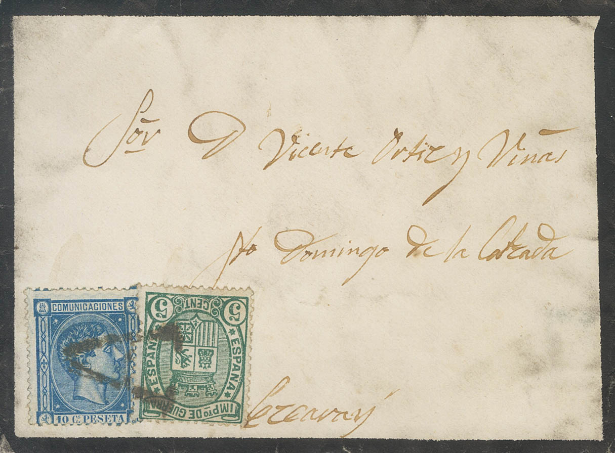 164, 154. (1875ca). 10 cts blue and 5 cts green. HARO to EZCARAY. Postmark "A", in black Haro fertilizer. MAGNIFICENT.