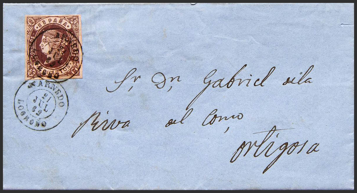 58. 1862. 4 cuartos chestnut. ENCISO (LA RIOJA) to ORTIGOSA DE CAMEROS. Postmark ARNEDO / LOGROÑO. MAGNIFICENT.