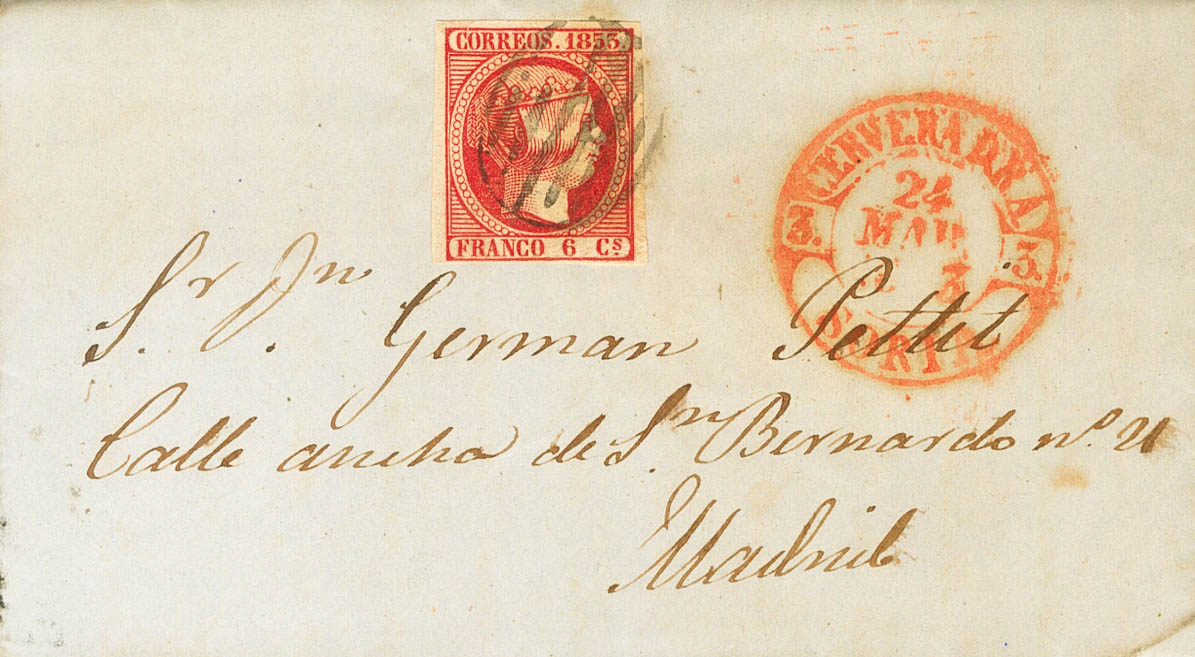 |ABOUT| 17. 1853. 6 carmine quarters. CERVERA DEL RIO ALHAMA in MADRID. On the front Baeza CERVERA DRA / SORIA, in red. MAGNIFICENT.