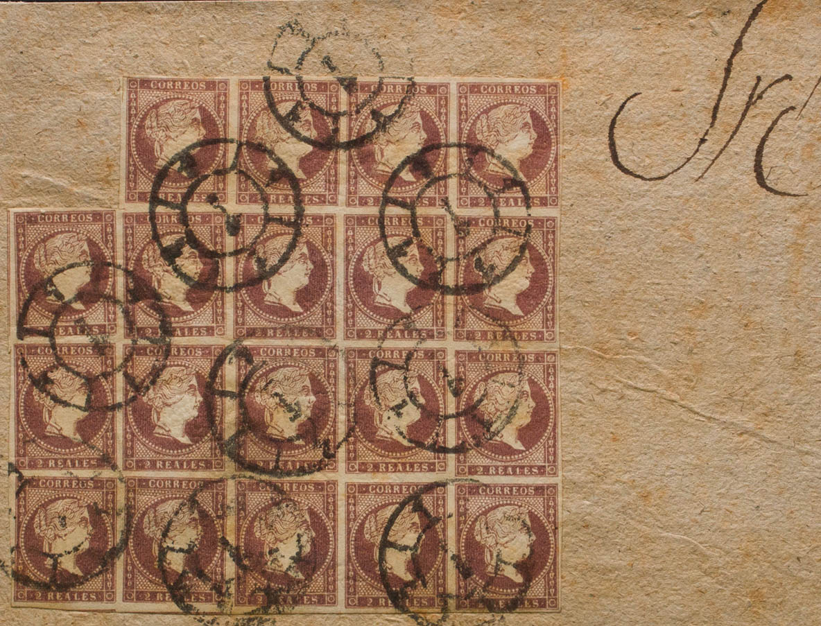 English △ 50(19). 1855. 2 reales violet, block of nineteen, on fragment. Postmark R. CARRETA Nº1. MAGNIFICENT. Building 2014: Edifil Euros