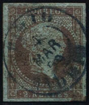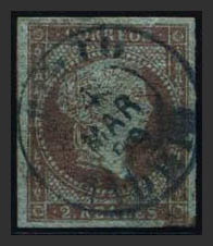 42. 1855. 2 reales violet. Postmark PINTO / MADRID (Type I), in blue. MAGNIFICENT AND RARE.