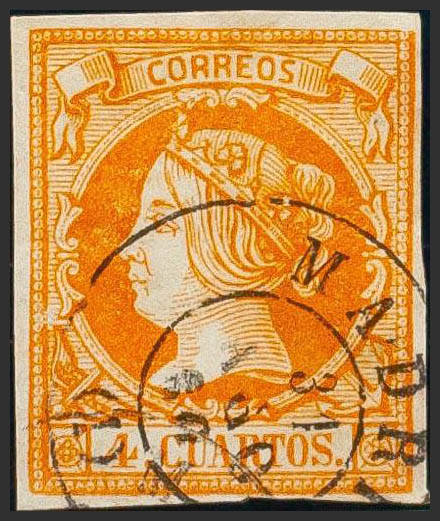 English 52. 1860. 4 cuartos yellow. Postmark MADRID / (1). MAGNIFICENT AND RARE.