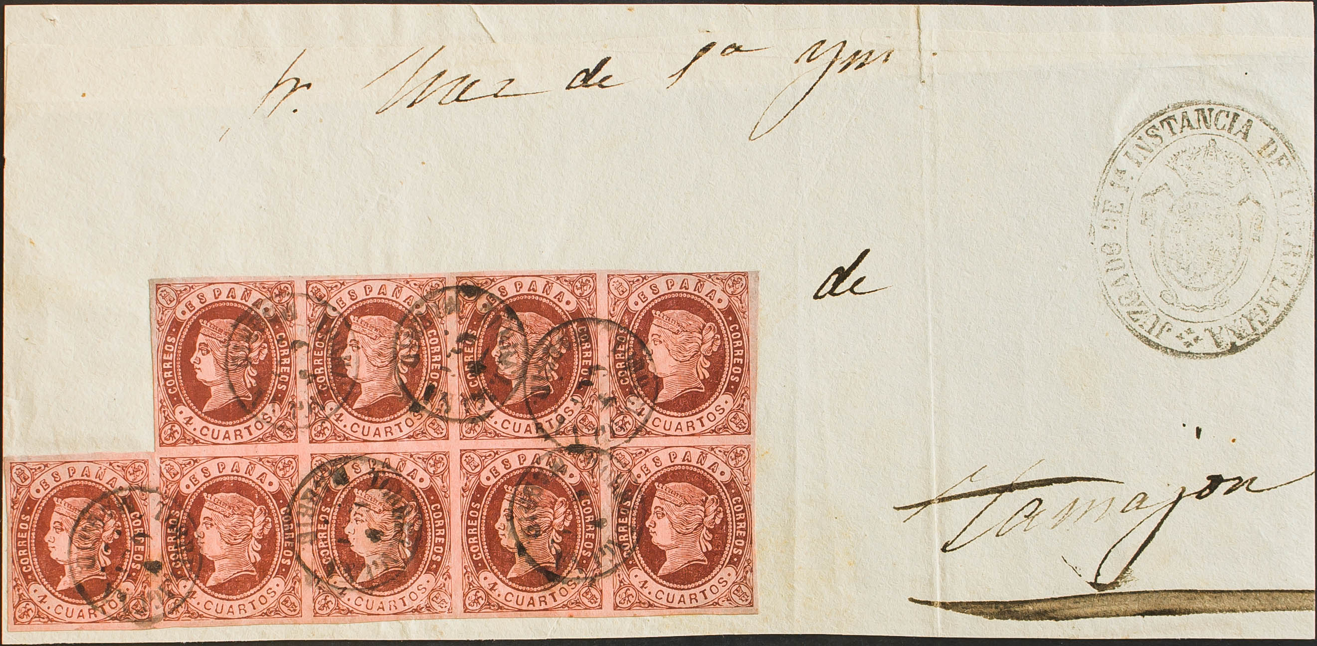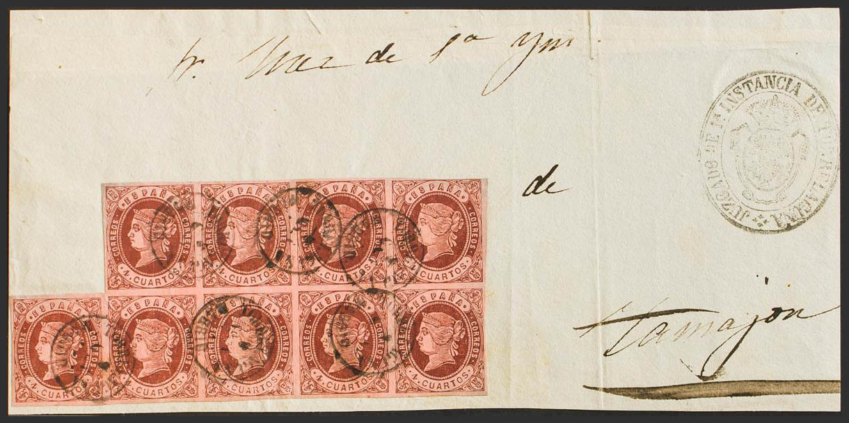 58(9). 1862. 4 chestnut cuartos , block of nine. Judicial Escrow from TORRELAGUNA (MADRID) to TAMAJON (GUADALAJARA). Postmark TORRELAGUNA / MADRID. MAGNIFICENT AND RARE. Certificate GRAUS.