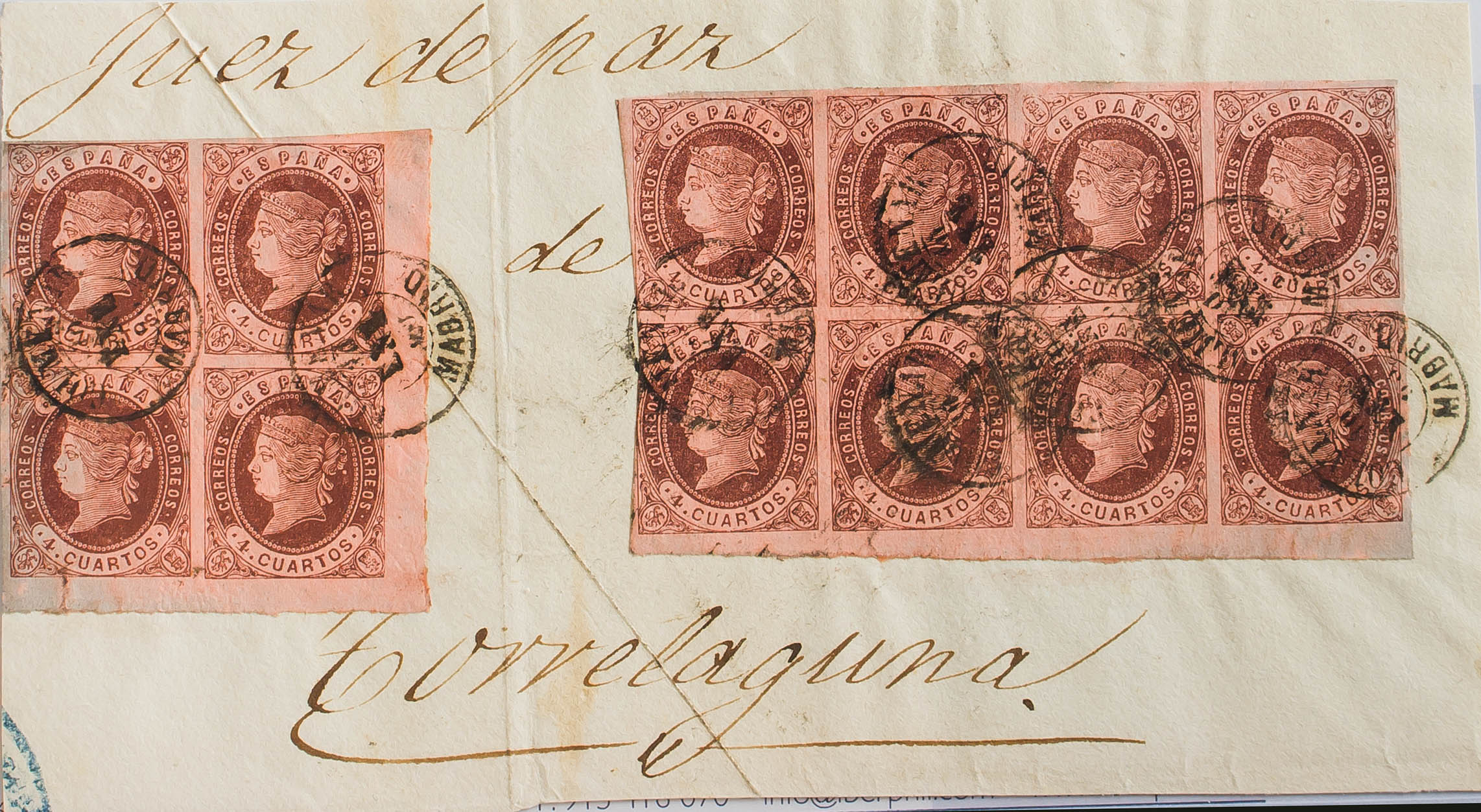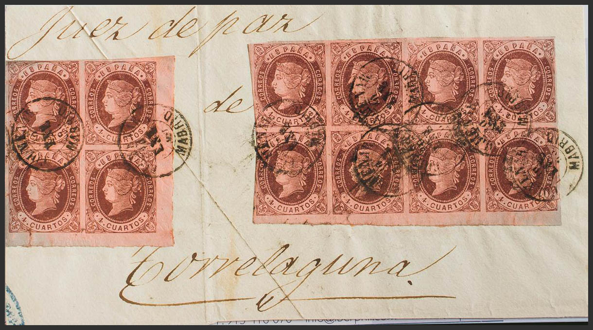 58(12). 1862. 4 chestnut cuartos , block of eight and four. Judicial Escrow from COLMENAR (MADRID) to TORRELAGUNA (MADRID). Postmark COLMENAR / MADRID. MAGNIFICENT AND RARE.