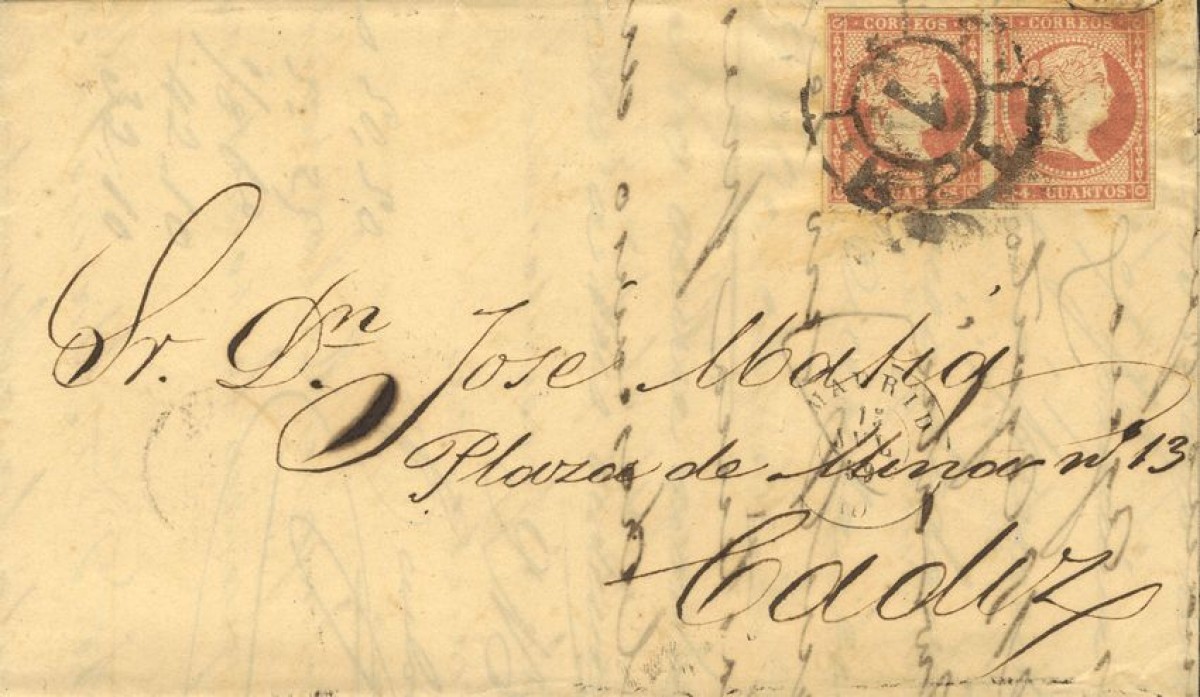 48(2). 1856. 4 cuartos red, pair. MADRID to CADIZ. Postmark R. CARRETA Nº 1.