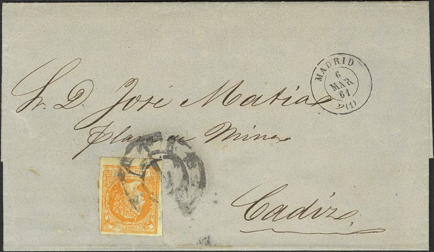 52. 1860. 4 cuartos yellow. MADRID to CADIZ. Postmark R. CARRETA Nº 1. MAGNIFICENT.