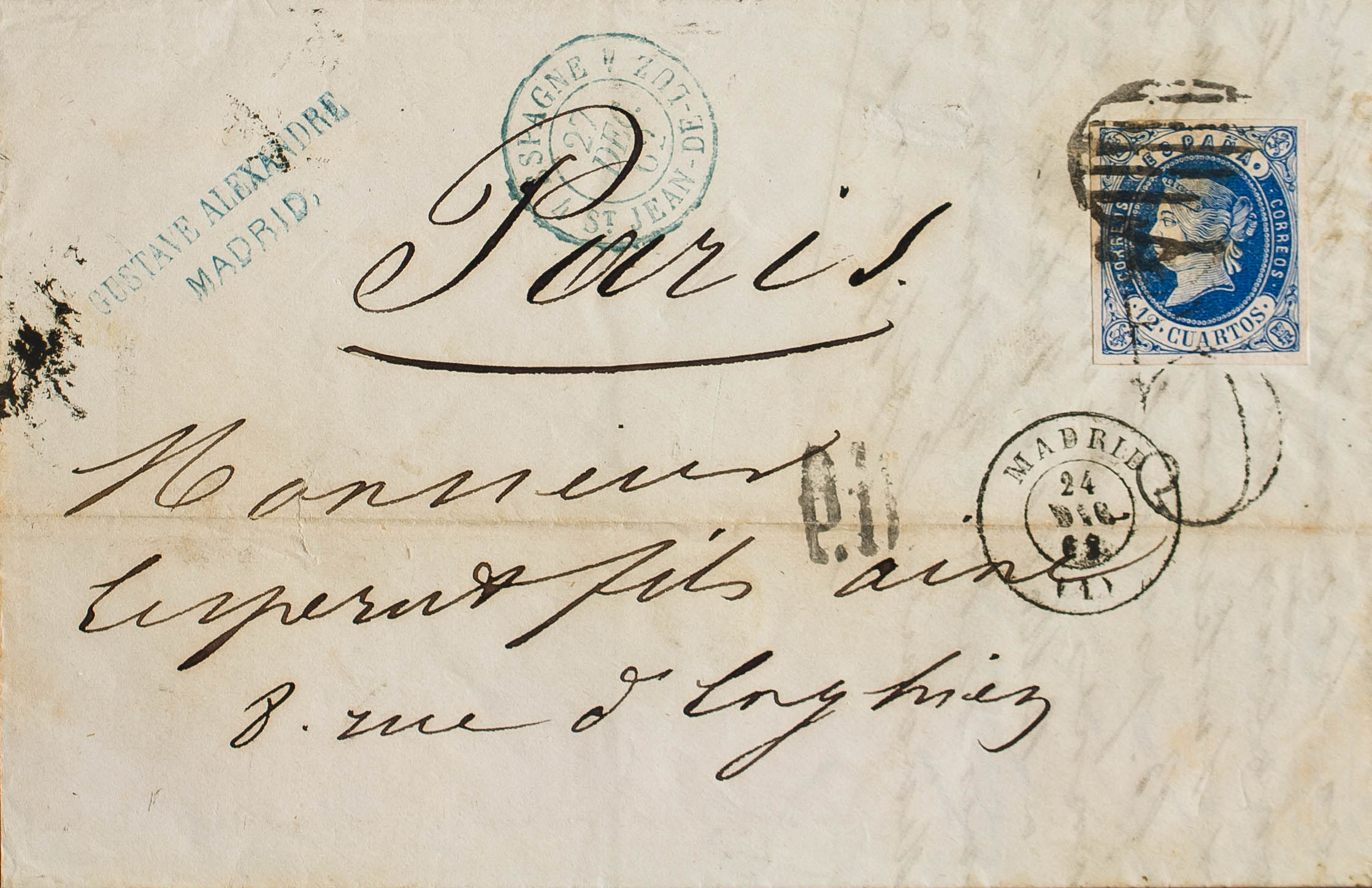 59. 1862. 12 cuartos blue. MADRID to PARIS (FRANCE). GRILL postmark. MAGNIFICENT AND RARE LATE USE OF THE GRILL POSTMARK.