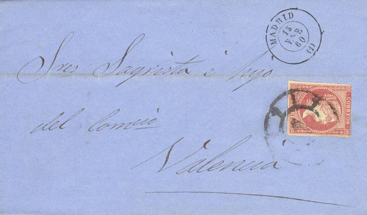 English 48A. 1856. 4 red cuartos . MADRID to VALENCIA. Postmark R. CARRETA Nº 1.